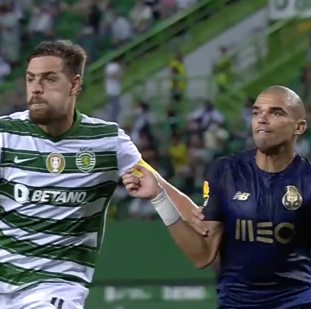 Segundo facto: após este primeiro contacto, Pepe elevou o braço, acertando com a mão na zona do queixo do central do Sporting.